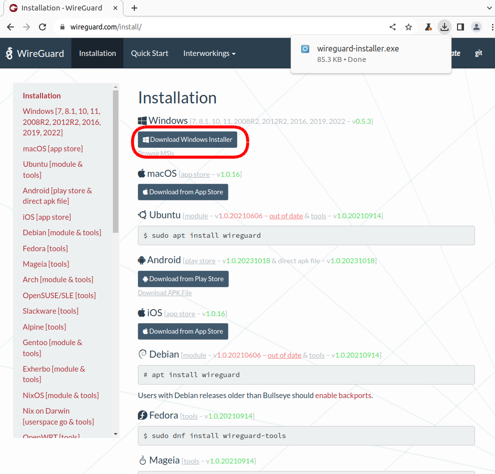 - Σε ένα παράθυρο του browser (φυλλομετρητή) της συσκευής σας πληκτρολογήστε τη διεύθυνση www.wireguard.com/install.