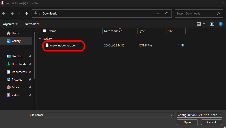 - Στη συνέχεια επιλέξτε το αρχείο παραμετροποιήσης (π.χ. my-windows-pc.conf) που λάβατε στο βήμα 5 και πατήστε "Open".