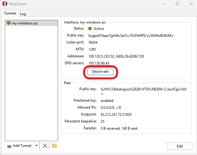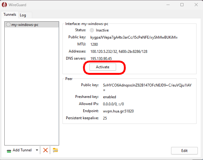 - Η διαδικασία έχει ολοκληρωθεί και πλέον στην εφαρμογή "WireGuard" θα βλέπετε τη σύνδεση σας, όπου πατώντας πάνω στο αντίστοιχο κουμπί μπορείτε να την ενεργοποιήσετε ή να την απενεργοποιήσετε αντίστοιχα.