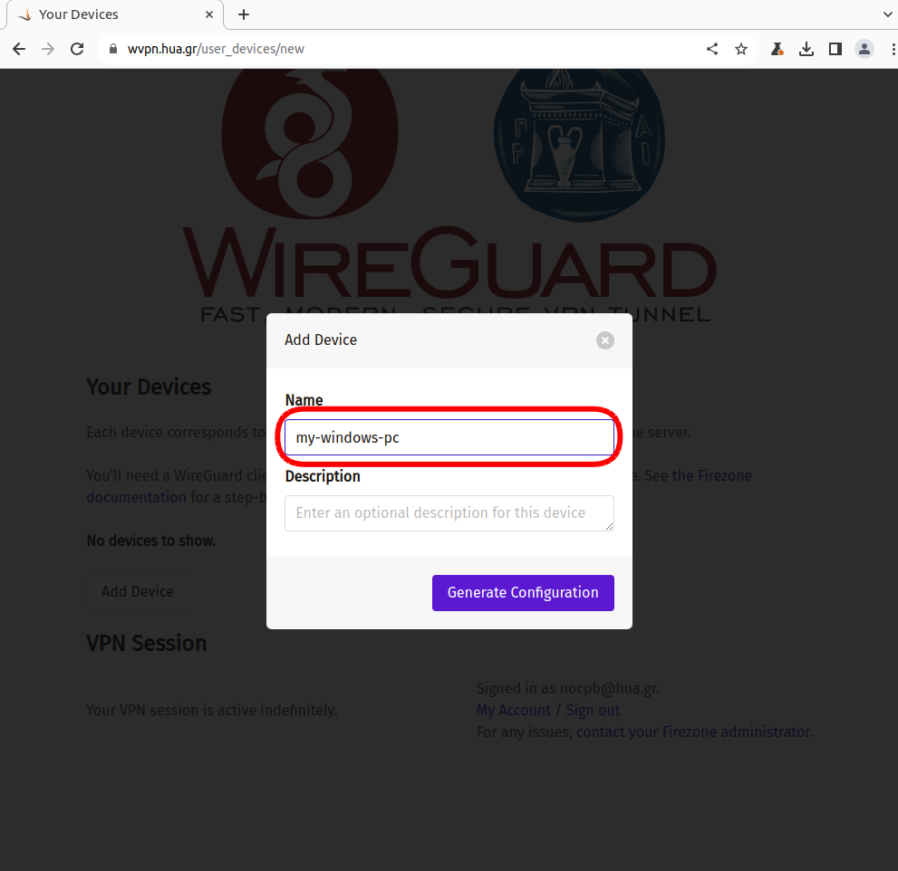 - Στη φόρμα που θα εμφανιστεί, στο πεδίο Name πληκτρολογήστε ένα αναγνωριστικό όνομα που επιθυμείτε για τη συσκευή σας (π.χ my-windows-pc) και πατήστε το κουμπί "Generate Configuration".