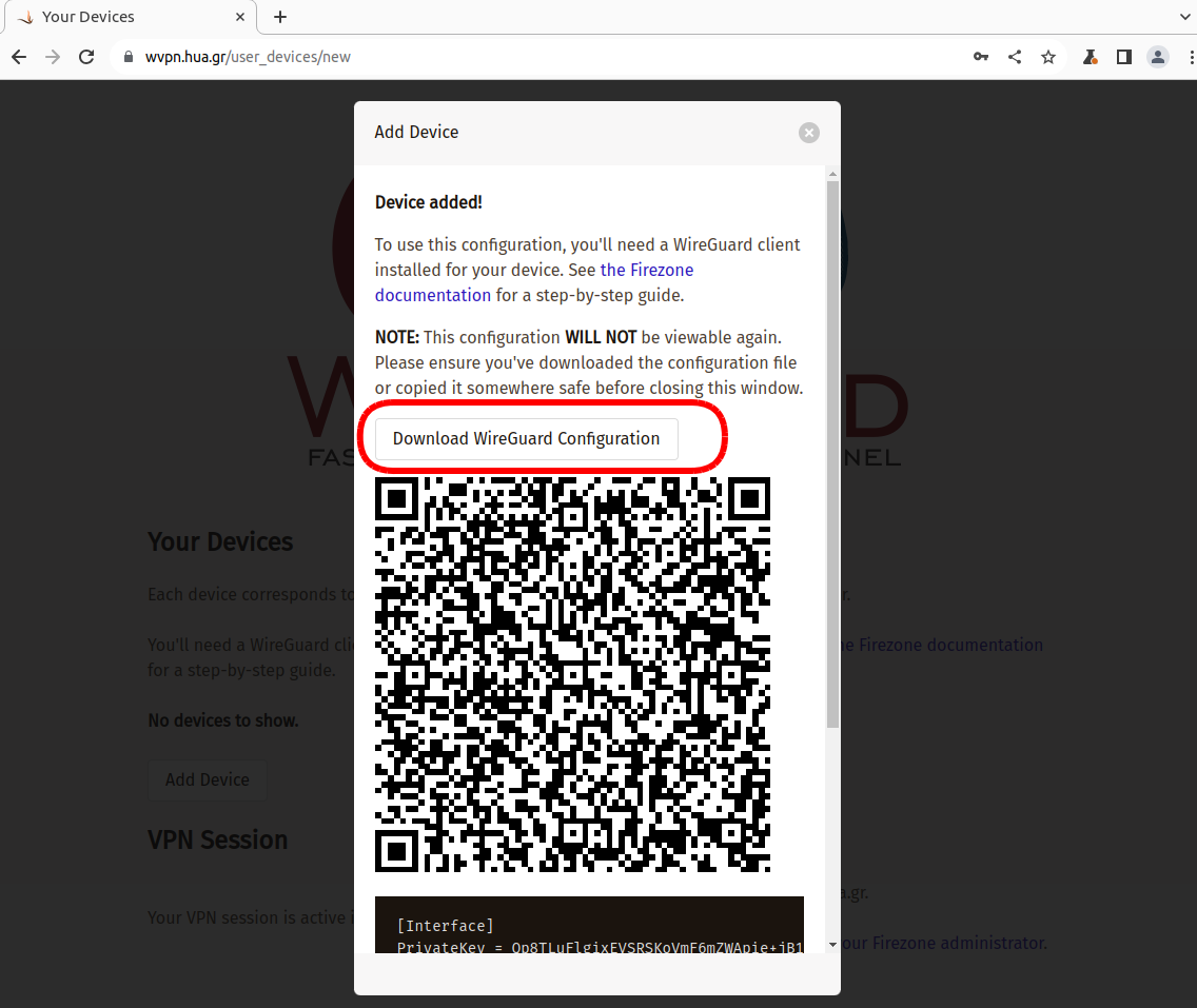 - Στην οθόνη που θα εμφανιστεί, πατήστε το κουμπί "Download WireGuard Configuration" και αποθηκεύστε το αρχείο παραμετροποίησης στη συσκευή σας.